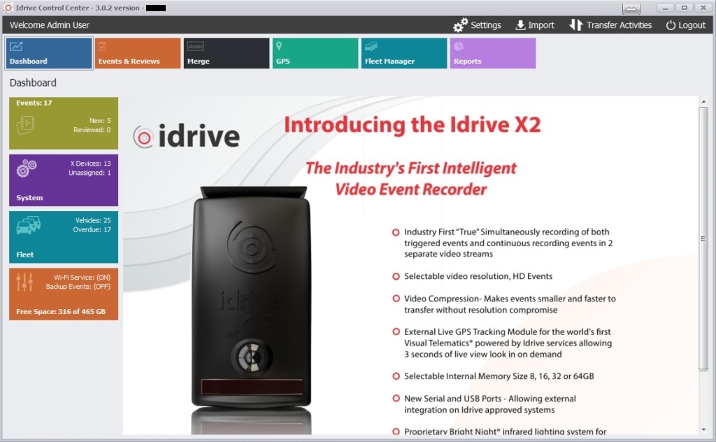 The Idrive Control Center 3.0 is the new generation of Professional Event Data Recorder management software which allows you to monitor and control all of the devices in your fleet. It has the capabilities to manage all of the data events, personnel, vehicle documents and scheduling. It performs downloads from the vehicles and can be used to review the events.